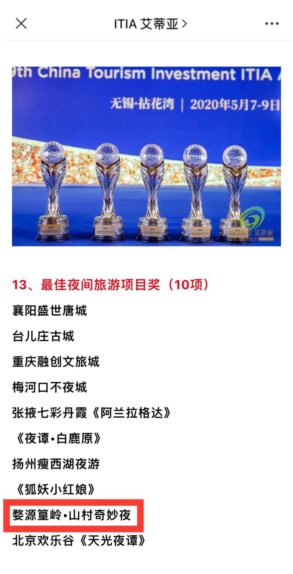 1月25日婺源篁岭“山村奇妙夜”获艾蒂亚奖最佳夜间旅游项目奖!