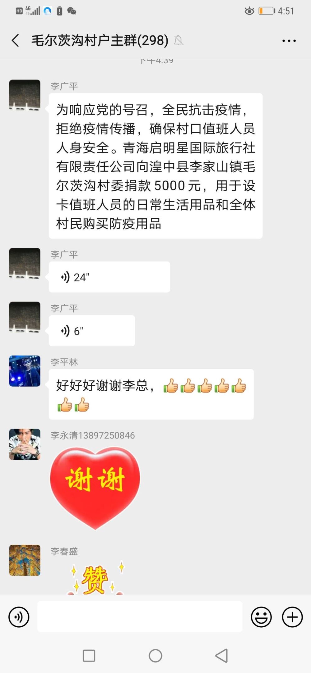 得知湟中县李家山镇疫情严重,青海启明星国际旅行社向西宁市湟中县李家山镇毛尔茨沟村委捐款5000元,用于购买村民防疫用品。