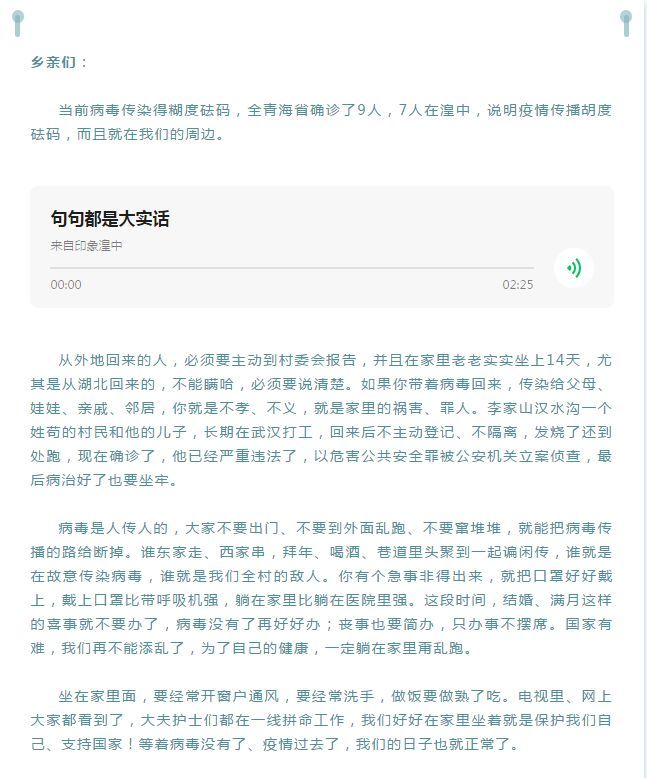 为积极响应青海省文联关于“动员文艺界创作出更多主题文艺作品,更好地发挥文艺作用助力打赢这场疫情防控战”的号召,我市文艺工作者积极发挥自身专业优势,用最朴实的语言和老百姓喜闻乐见的艺术形式,宣传疫情防控,致敬抗疫英雄,在短短两天时间内创作出5部以抗击疫情为主题的艺术作品,并完成音频录音和视频制作工作。他们用文艺创作鼓舞士气,提振信心,以实际行动助力疫情防控狙击战!