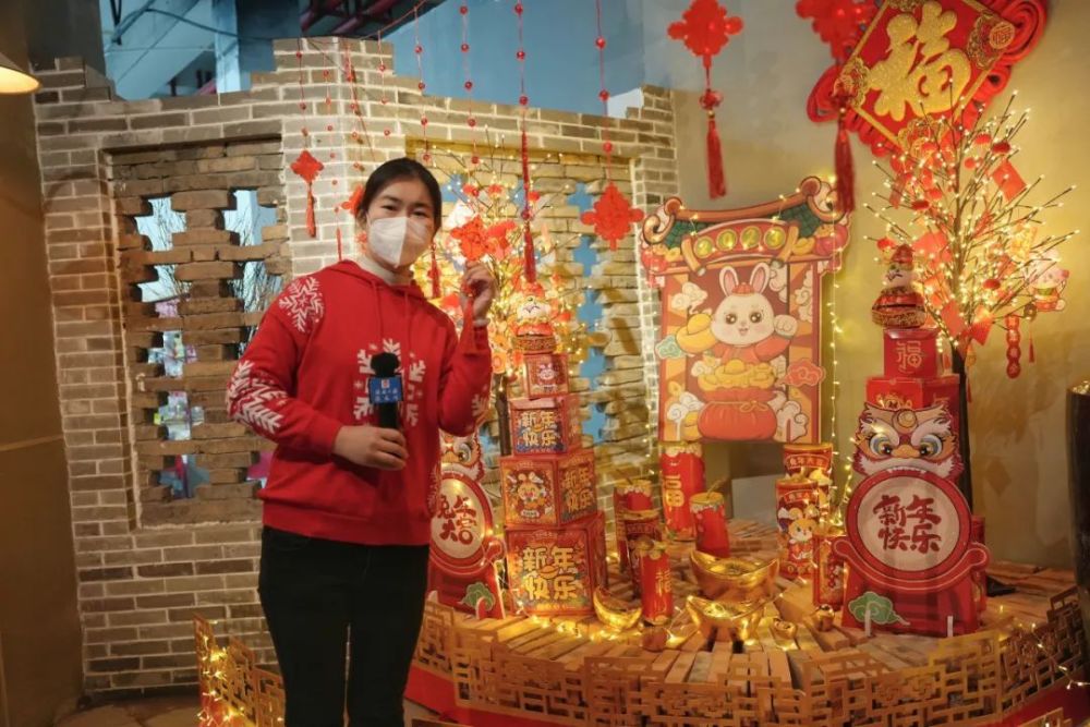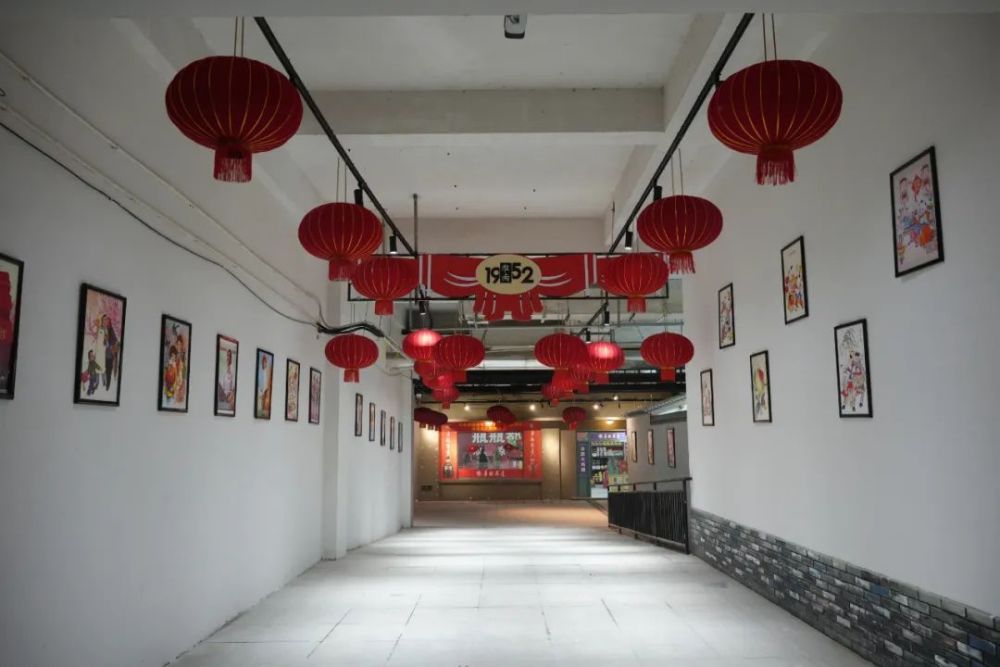 一走进1952街区,浓浓的年味便扑面而来,街区悬挂“福”字挂件、大红条幅等新年装饰物品,既可以营造活动现场的气氛,又可以作为指示标牌,引导游客前往年货节现场。醒目的“新春角”里放置了好几棵发财树,上面密密麻麻地挂着小灯串、金元宝以及满是笑容的兔年娃娃,一个个红包礼盒整齐地码在地上,让人忍不住走上前去拆一个试试运气。