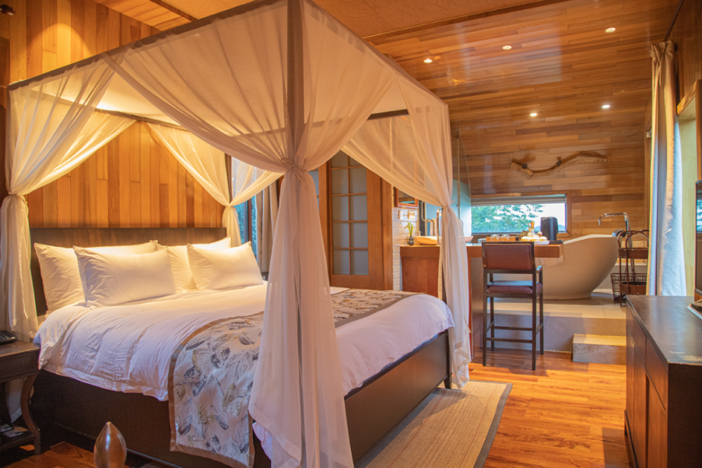 星空木屋酒店独具特色的木屋设计,还有多种房型供你选择,每一个房间都是独栋独间,给你最私密的居住环境。每一个木屋都配有独立的浴缸和卫生间,即使在森林中,也给你最贴心的居家服务。