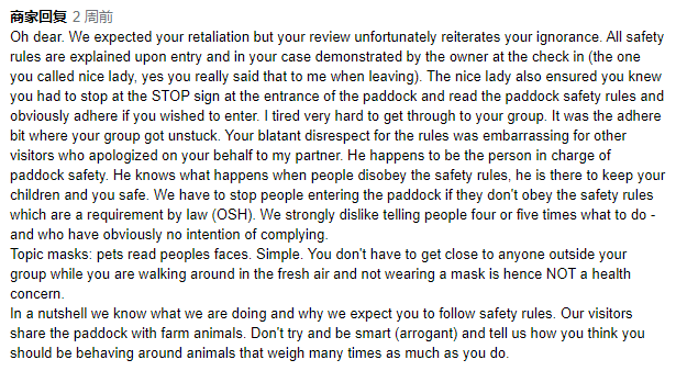 我们观察到,在五百多个留言里,农场方面对明显是亚洲姓名的差评多数都直接表示“那是游客不遵守安全规则”,并细数每位差评游客的不是。