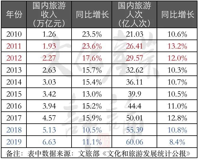 按照国民经济统计口径,文化产业评论(ID:whcypl)对比分析发现,从2010年起到2019年的第四个10年,国内旅游收入由12580亿元增加至57251亿元,增长455.10%,同样翻了“两番”;国内旅游人次由21亿人次增加至60亿人次,增长286.20%,同样增长了2倍多。