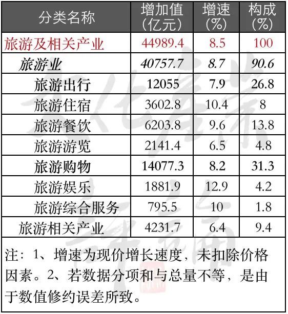 为便于理解,就什么是“旅游及相关产业”作个普及。根据国家统计局旅游指标解释,就是指在国民经济活动中为游客直接提供行、住、吃、游、购、娱等旅游服务,以及为旅游提供相关服务活动的集合。