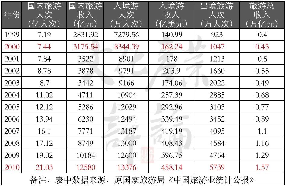 对比2000年与2010年的数据,文化产业评论(ID:whcypl)惊奇地发现,进入第三个10年,国内旅游人数(从7.44亿人次增加到21.03万亿人次)增长了182.66%,是2000年的约3倍;国内旅游总收入(从0.45万亿元增加到1.57万亿元)增长了248.89%,增加了3倍以上。