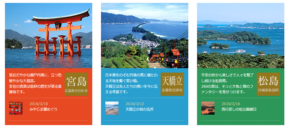 这三处景点早在德川幕府建立初期便已风靡于全日本,此后逐渐成为日本景色的象征,并被编写入日本民歌、教科书等宣传材料之中。