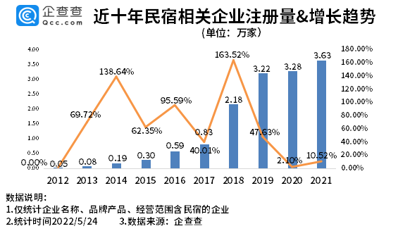企查查数据显示,我国现存民宿相关企业13.83万家。近10年来,我国民宿相关企业注册量整体呈上升趋势。尤其是在疫情中的2021年,新增3.63万家,同比增长10.52%。