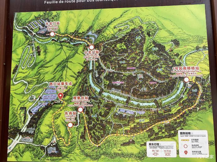 从西门站做摆渡车只能到长肖站,然后步行到观景台,这里可以俯瞰真个千户苗寨,然后再排队做摆渡车到1号风雨桥站,建议自驾游的朋友在进入景区前,收拾一下当晚的换洗衣物轻装进入,一号风雨桥下车后,前方就是一条蜿蜒的主街,两边有很多可以进入的古巷,慢慢的游览的同时也可以找自己心仪的客栈,走到小北门站就可以沿着河往回游览,四号风雨桥头是一个小吃夜市,琳琅满目的什么吃的都有,我是在四号风雨桥头找了一间靠山的民宿,就在观景台的正下方,走台阶8分钟左右就可以上到观景台,晚上观夜景非常方便