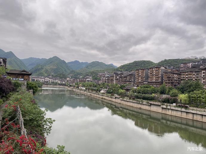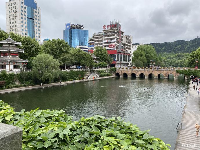 梵净山西门下午5点出发,240公里3个半小时车程到达遵义市区,天然河道游泳场,远处是凤凰山。