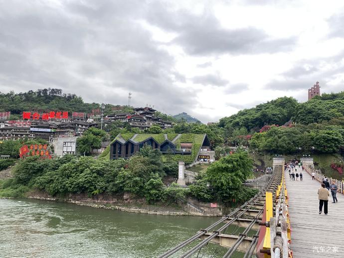 吊桥对面右前方的红色建筑就是四渡赤水纪念塔