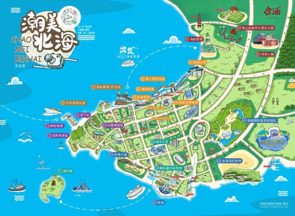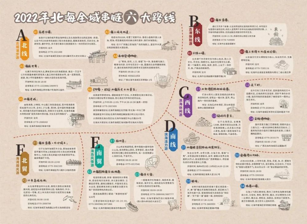 A1高德古镇——A2海上观光栈道——A3海底世界——A4南珠宫博物馆——A5北海老城——A6《印象·1876》北海历史文化景区