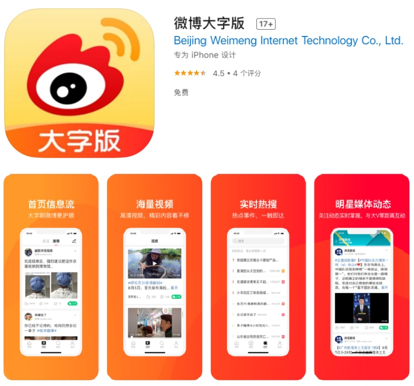 近日,微博在苹果App Store上线大字版APP,专为老年人及视障人群打造,除将字体放大之外,还支持辅助工具读屏。在体验上,以简洁无广的界面为主,大字版中仅保留关注流、热门微博、视频流及实时热搜,在每条微博下方,设有一键分享至微信的按钮;在内容呈现上,以海量高清短视频、图文为主体。目前。