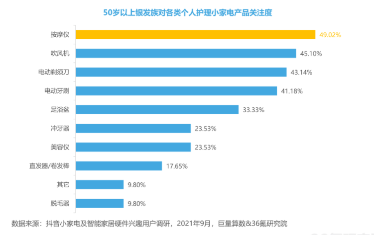 近日,巨量算数联合36氪研究院发布的《2021中国新锐品牌发展研究之小家电及智能家居硬件报告》显示,银发族在购买小家电产品时,除了安全性、便捷性等因素,对产品功能也有更多差异化需求。根据巨量算数小家电消费者调研数据,个人护理小家电在银发族中受关注度提升,近六成银发族购买过这类小家电。其中,健康养生类产品最受欢迎,约49%银发族表示按摩仪为其最想购买的个人护理小家电。