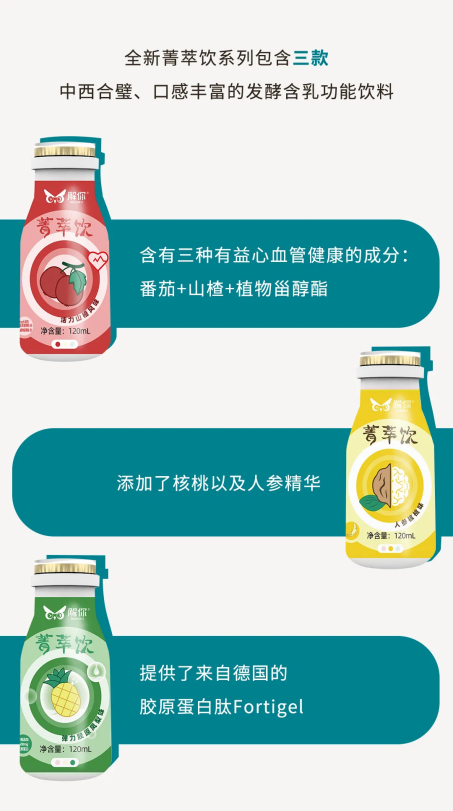 据雀巢中国官方消息报道,雀巢研发(中国)针对中老年人三大健康困扰——三高、认知功能减退与行动力下降,推出全新菁萃饮系列。通过携手中国功能性食品解决方案商曼士元,结合银发消费者的口味偏好,全新菁萃饮系列将上市活力山楂风味、人参核桃味和弹力胶原凤梨味三款发酵含乳功能饮料产品。