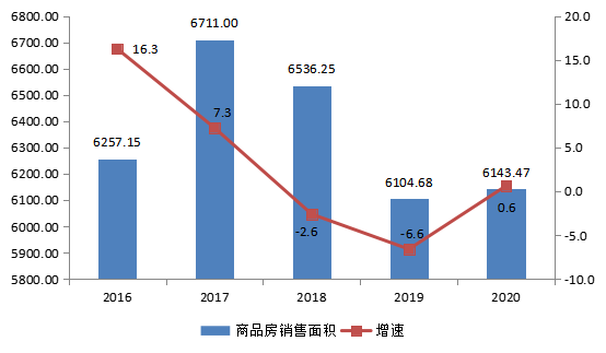“十三五”时期,随着重庆经济社会步入平稳发展轨道,城市基础设施建设逐步完善,区域中心城市体系结构逐步形成,特大城市功能日趋完善,重庆主城及辖区内各级城镇对资源和人口的聚集能力进一步提升,全市城镇人口不断增加,各类购房需求得到有效释放,促使商品房销售市场进入新一轮周期。全市商品房销售面积自2016年达到6000万平方米以上后,于2017年达到历史峰值6711.00万平方米,此后随着房地产销售市场逐步趋于饱和及房地产市场调控政策常态化,全市销售面积有所回调,但总量仍保持在6000万平方米以上。“十三五”时期全市累计销售面积是“十二五”时期的1.3倍;年均增长2.7%,较“十二五”时期下降1.8个百分点。2020年,全市疫情防控取得阶段性胜利,居民信心得到极大提振,商品房销售市场进入平稳恢复期,商品房销售面积6143.47万平方米,较上年增长0.6%。
