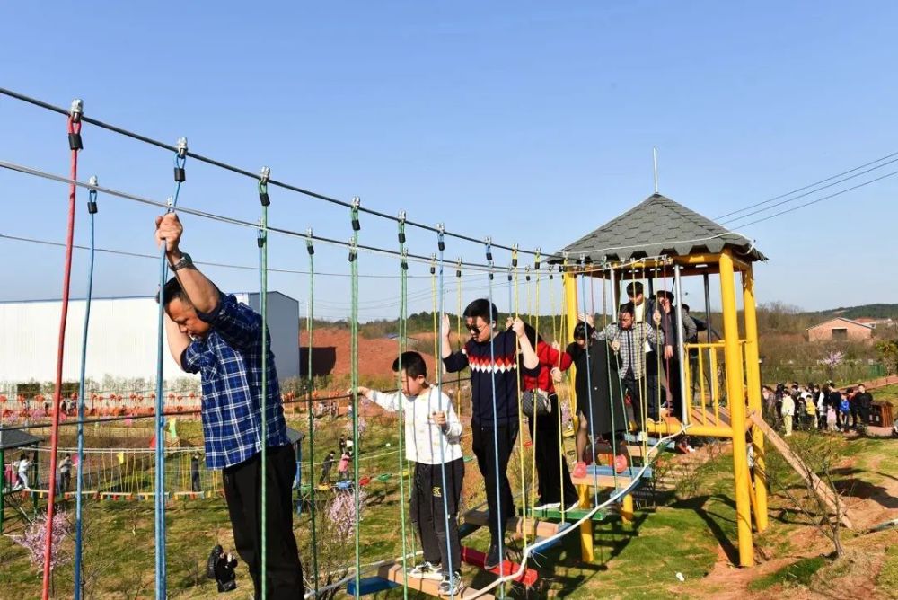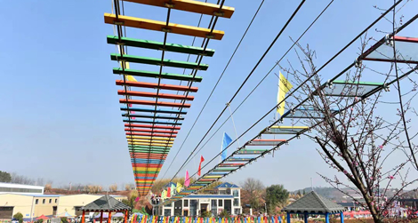 “步步惊心”项目以惊险刺激,游客参与度高、体验度高的优势脱颖而出。项目跨度约200米,脚踏板之间的间隙有宽有窄,间隙下方是百亩梅花林和池塘,在“步步惊心”上跨越,体验漫步云端的刺激。