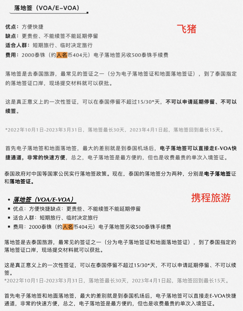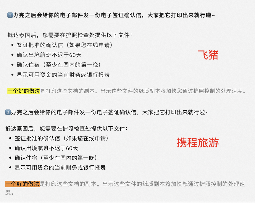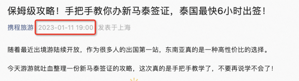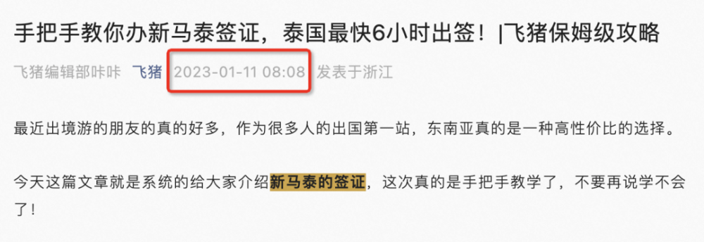 文中显示飞猪是在1月11日早8点左右发布的推文,名为《手把手教你办新马泰签证,泰国最快6小时出签!|飞猪保姆级攻略》。携程则是在11日晚7点发布的推文,名为《保姆级攻略!手把手教你办新马泰签证,泰国最快6小时出签!》,经查重两者的相似度为93%。