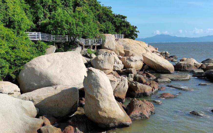 在沙滩上遥望古舟岛,苍翠绿树掩映乱石堆滩,岛上保留原始的天然风貌,巨石高耸雄伟,经海水洗礼,石头像蟾蜍、像雄狮、像驼峰,千沟万壑,呈现奇形怪状的姿态,岛岸上古榕参天,盘绕在大石上,相互纠缠,简直如一幅幅神奇的影像,妙趣横生,引人入胜。