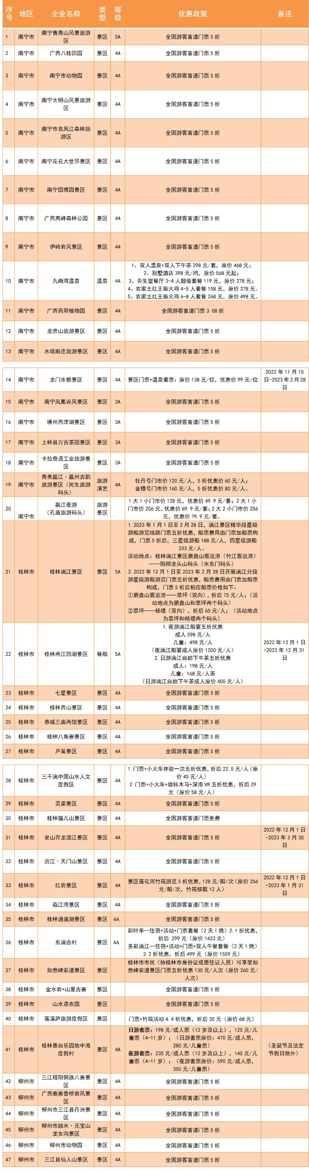 全国各地游客凭本人有效身份证件,可享受广西180多家A级收费旅游景区门票五折优惠,部分景区还推出了首道门票免费等优惠政策。