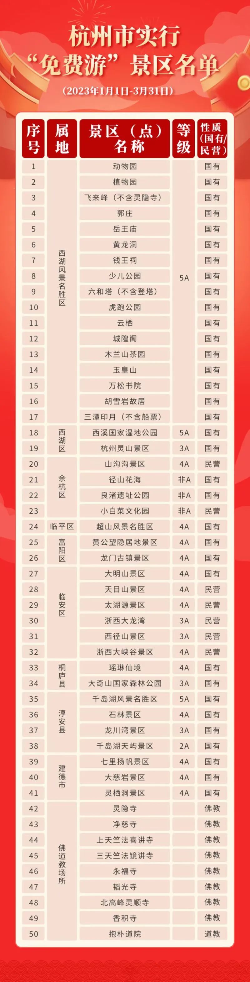 西湖景区、西溪湿地、良渚遗址公园、千岛湖、大明山、天目山、黄公望隐居地、瑶琳仙境、七里扬帆等41个景区景点。