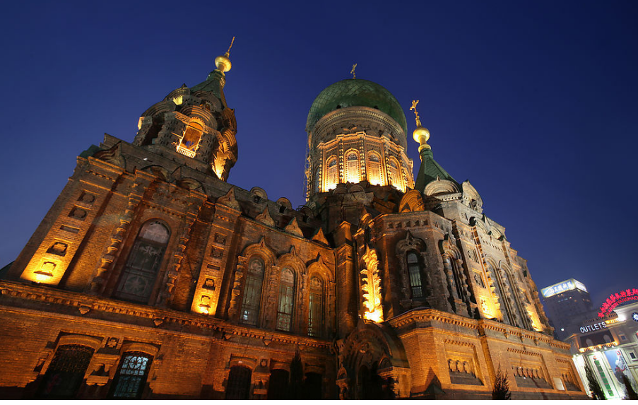 2.索菲亚教堂;圣?索菲亚教堂是哈尔滨宗教建筑的经典代表,始建于1907年3月,是俄罗斯帝国东西伯利亚第四步兵师修建的随军教堂。同年,重修为全木结构。1911年,教堂第一次扩建,在木墙外部砌一层砖墙,从而形成砖木结构。1923年9月23日开始第二次扩建,历时九年时间,于1932年11月25日最终建成。