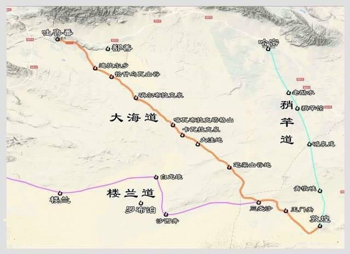 2、楼兰道,关于楼兰道的具体路线,据《魏略·西戎传》记载:“从玉门关西出发都护井,回三陇沙北头,经居卢仓,从沙西井转西北,过龙堆,到古楼兰,转西诣龟兹,至葱岭,为中道。” 楼兰道是内地通西域最便捷的道路。