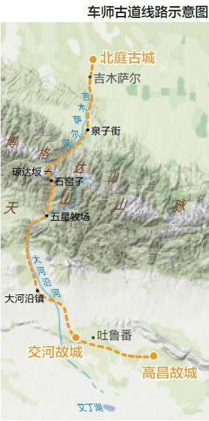 1、银山道:右道出天山县界,西南向焉耆国七百里,多沙碛卤,唯近烽足水草,通行马行。交河故城-盐山烽遂-阔坦图尔古城-布干烽燧-且克曼古城遗址(天山县)-干沟-苏巴什沟-库米什镇。唐代西州到焉耆之路,因途经银山(即今新疆托克逊县境内的库米什山)而得名。北魏时已通,起点为今高昌古城,终点为今焉耆回族自治县境内的四十里城子。中间经过托克逊、苏巴什达坂、库米什、榆树沟、乌什塔拉、喀喇沁尔等地,全程约430公里。