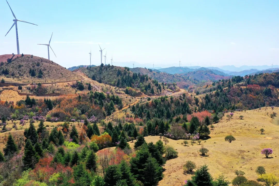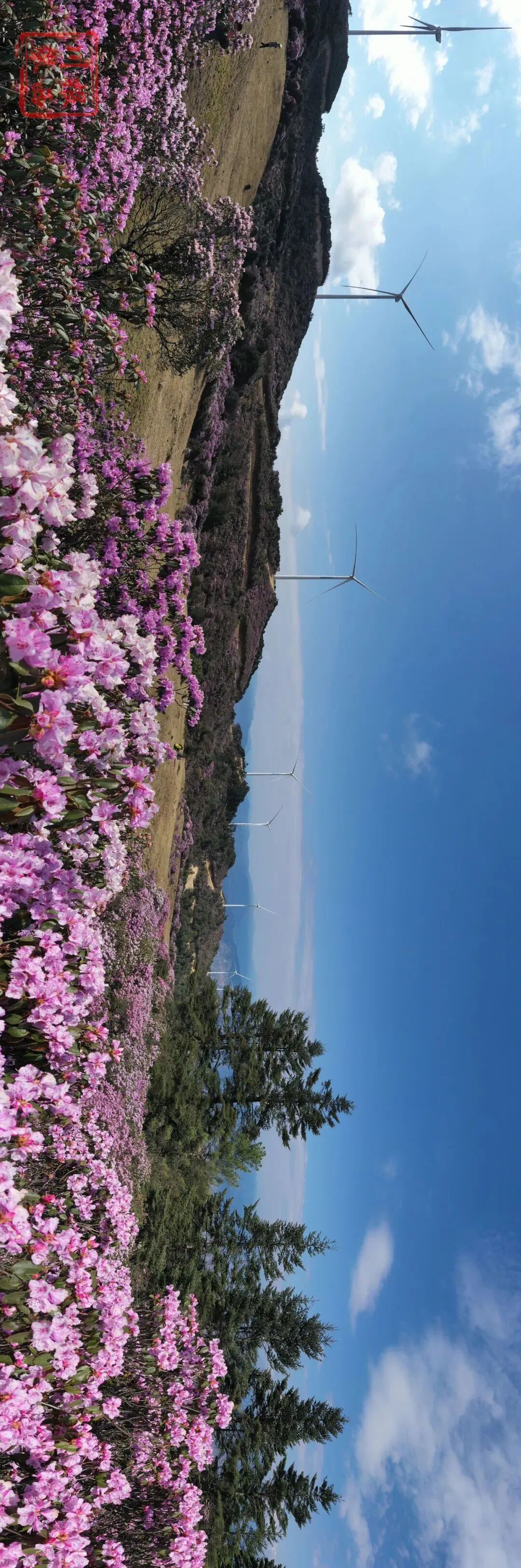 站在山顶看去,色彩绝伦的索玛花鲜艳夺目,错落有致的风力发电机在山脊迎风而立,蓝天、风车、青峰、红花、绿树,宛若人间仙境。
