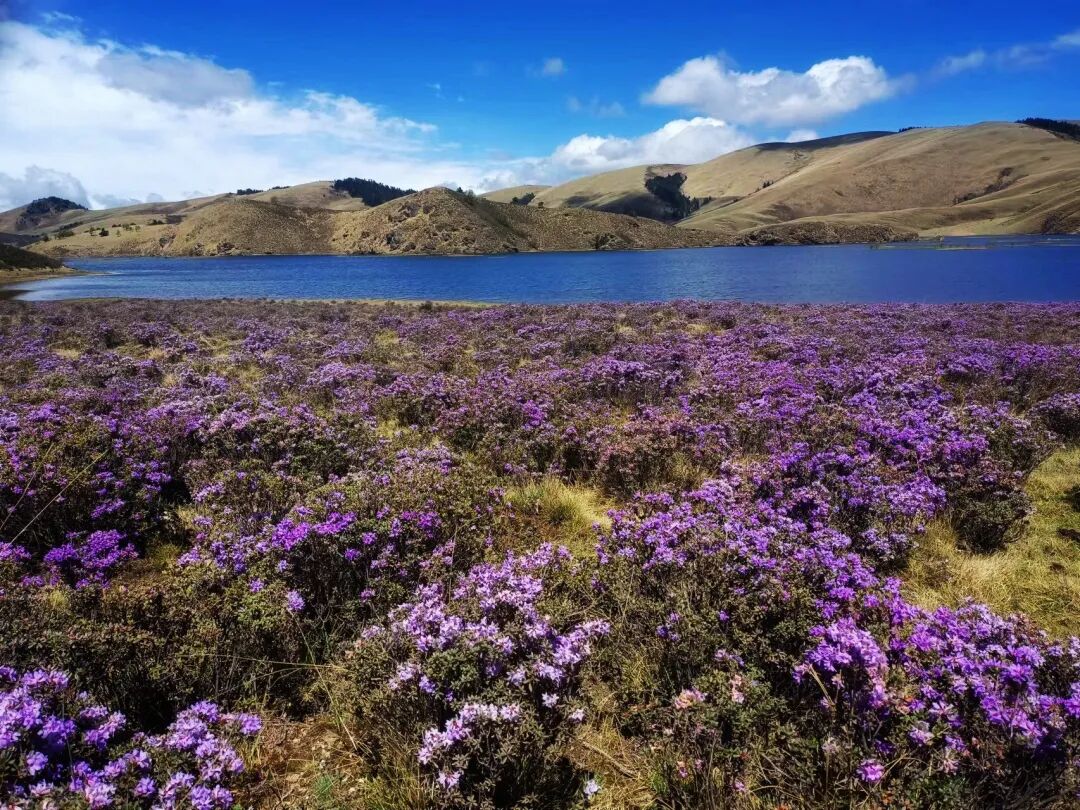这片索玛花海一直顺着海子向外蔓延,遇上阳光灿烂白云朵朵的日子,水草的触感、索玛花的芬芳,还有湖面成群嬉戏的野鸭,当是一幅绝美的高山风景画。许多游客不远千里,翻山越岭,只为一睹海子深处的壮观花海。