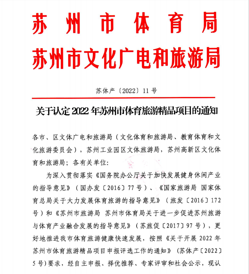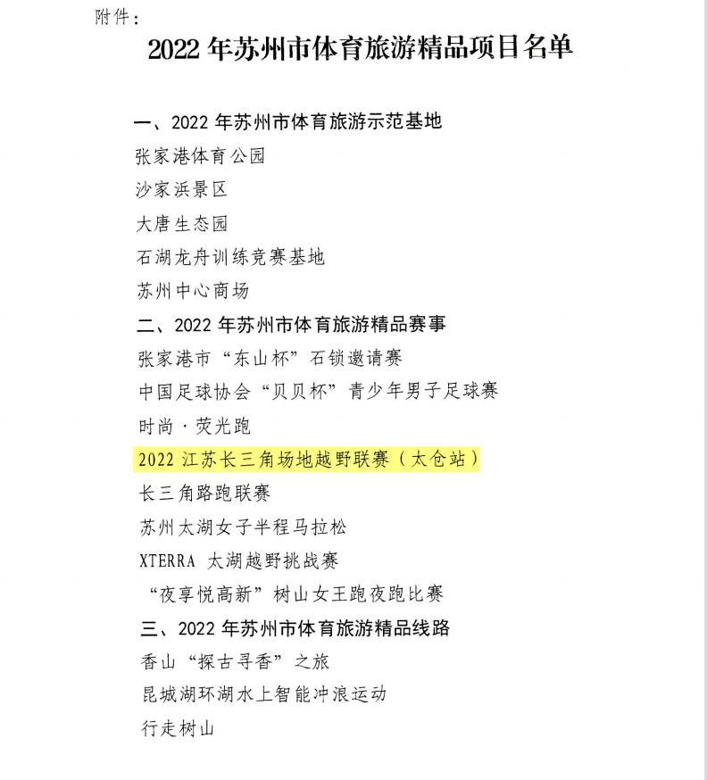 近日,苏州市体育局与苏州市文化广电和旅游局共同下发《关于认定2022年苏州市体育旅游精品项目的通知》,我市新动力(太仓)越野基地承办的2022长三角场地越野联赛(太仓站)获评为“2022年苏州市体育旅游精品赛事”。