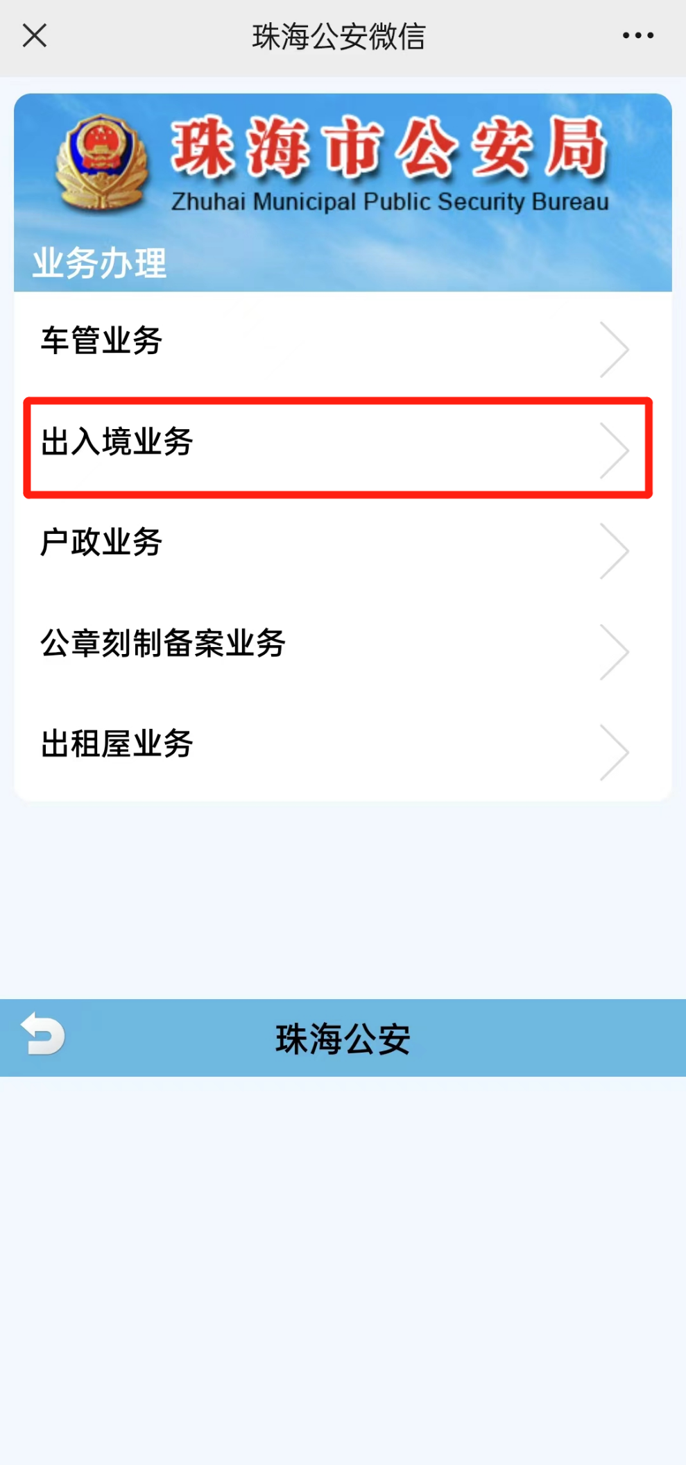 关注“珠海公安”微信公众号,选择“业务办理”—“出入境业务”—“申请证件预约”。