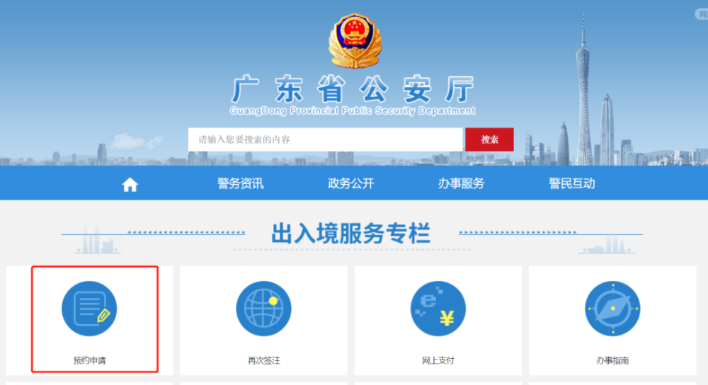 登录广东省公安厅出入境政务网,选择“预约申请”。