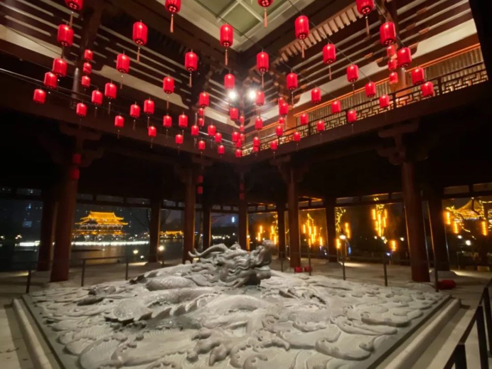 大唐芙蓉园的“新春大潮会”,将推出30余组风格各异的主题灯组。御苑门外广场的“花开盛世”灯组,以芙蓉花为主体,创造灯火璀璨的赏灯氛围。大家熟悉的“龙凤呈祥”灯组也再次舞动于芙蓉桥之上,带领游客沉浸体验西安年。
