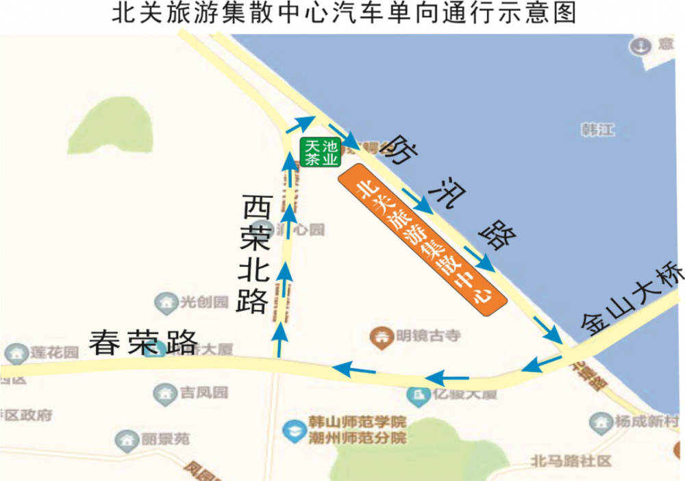 驶入时:春荣路西荣北路天池茶业路口(右转)防汛路北关旅游集散中心