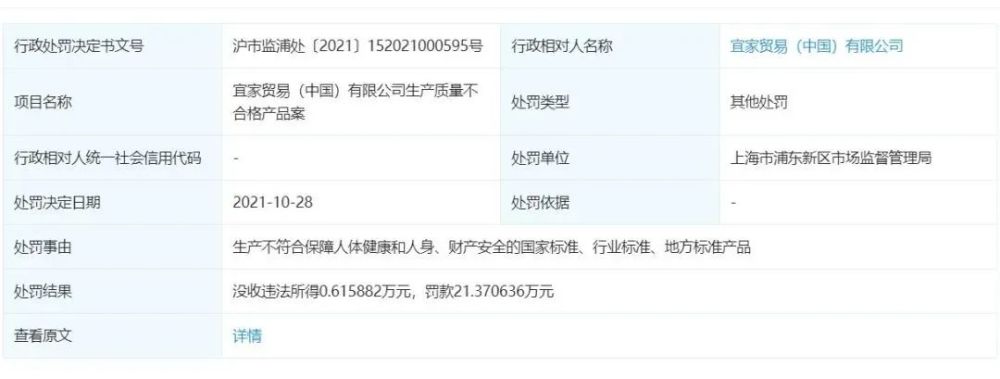 近日,宜家贸易(中国)有限公司新增行政处罚信息,因生产不符合保障人体健康和人身、财产安全的国家标准的产品,被上海市浦东新区市场监督管理局罚款21.37万元。详情为,该公司销售的被套和枕套不合格,共计1456件,目前已全部售罄。