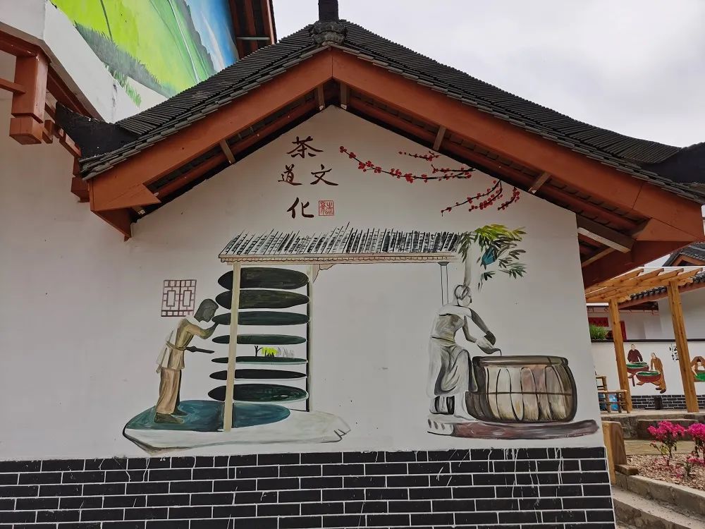 这里的房屋外墙,都被描绘上一幅幅赏心悦目的壁画。或是山水田园,或是六堡文化,以绿色为主色调,在白墙瓦黛的映衬下,让人耳目一新。