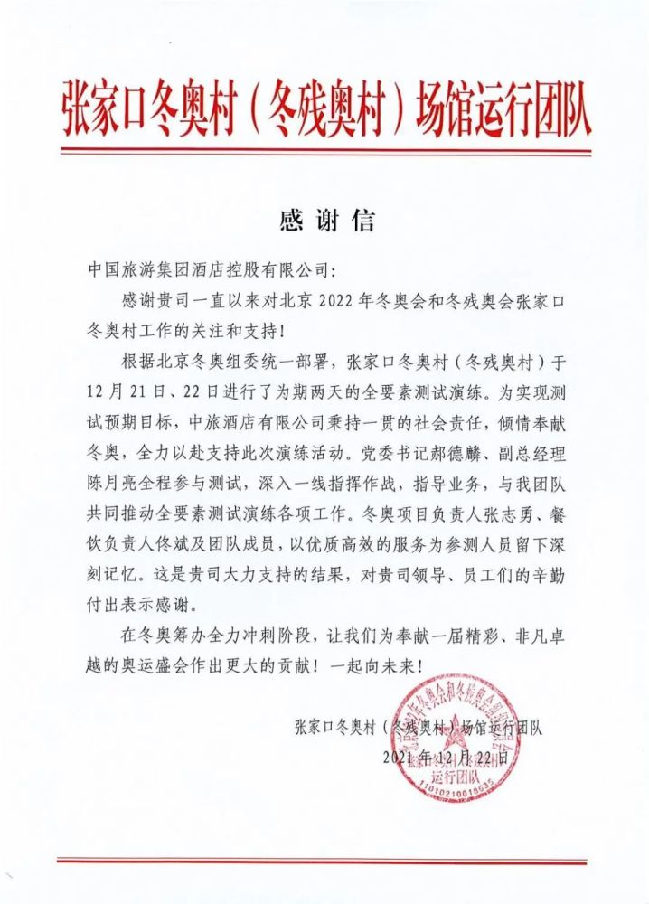 就在不久前,张家口冬奥村(冬残奥村)开展全要素测试演练,约700名中国旅游集团冬奥会服务团队的工作人员参与演练,顺利通过实战检验。中旅服务团队安全接待了参与测试的各代表团,高质量完成了运动员公寓1,355套房间、1,650张床位的住宿服务,全力保障了运动员和工作人员餐厅的早、午、晚三餐供应,其中12月21日即有2,500余名参测人员用餐。测试结束后,冬奥组委相关领导对本次测试活动给予了高度认可,张家口冬奥村(冬残奥村)场馆运行团队特别发来感谢信。