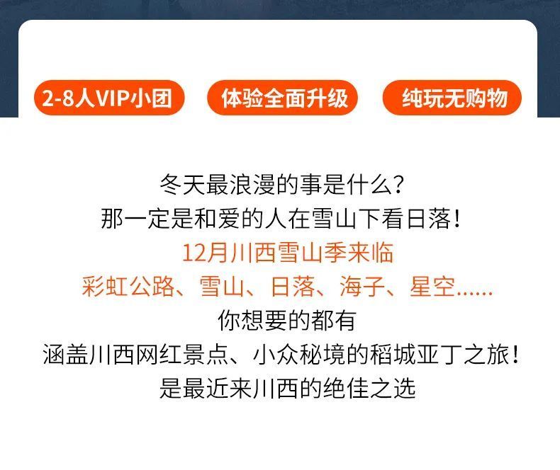 (4)冬季因冰雪天气影响,牛奶海、五色海会视情况封闭,不能游览,敬请见谅;当天游览线路参考:景区游客中心~景区观光车40km~扎灌崩~徒步0.5km~冲古寺~徒步1.5km~卓玛拉措(珍珠海)~仙乃日神山~冲古服务区~游览车6.7km~洛绒牛场(三怙主雪山)~原路返回出景区。