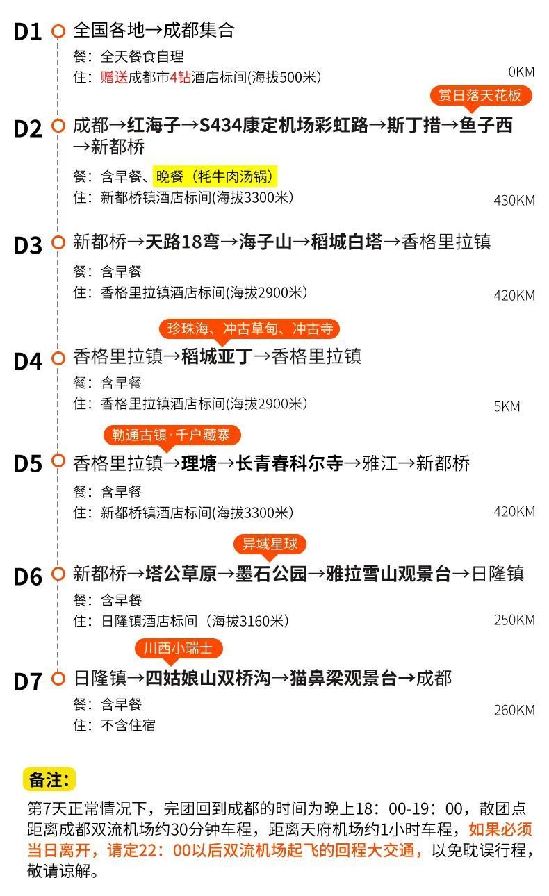 (1)以上行程时间安排可能会因天气、路况等原因做相应调整,正常情况下完团回到成都的时间为晚上18:00-19:00,散团点距离成都双流机场约30分钟车程,距离天府机场约1小时车程,如果必须当日离开,请定22:00以后起飞的回程大交通,以免耽误行程,敬请谅解;