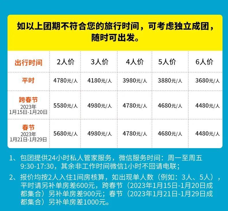 春节及跨春节(2023年1月15日-1月29日集合)所有团期,确认报名后,所有费用不退。