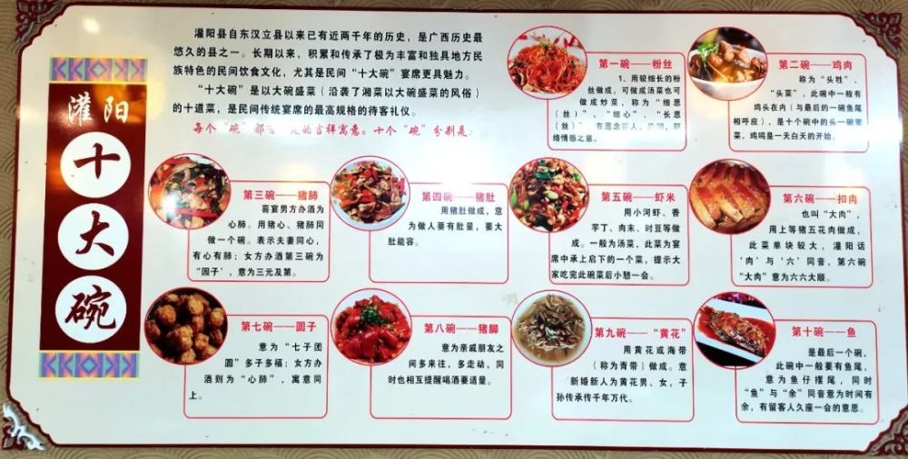 “十大碗”在灌阳是一种独特的饮食文化,只有在重大喜庆之时或来了特别贵宾才出“十大碗”。