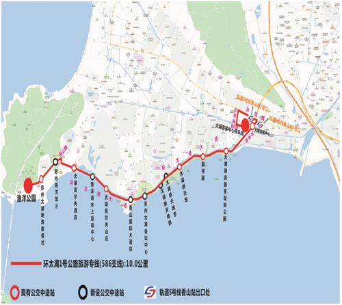 太湖游客中心停车场、蒯祥路、外塘路、孙武路、胥香路、环太湖大道、舟山路、环太湖大道、渔洋公园