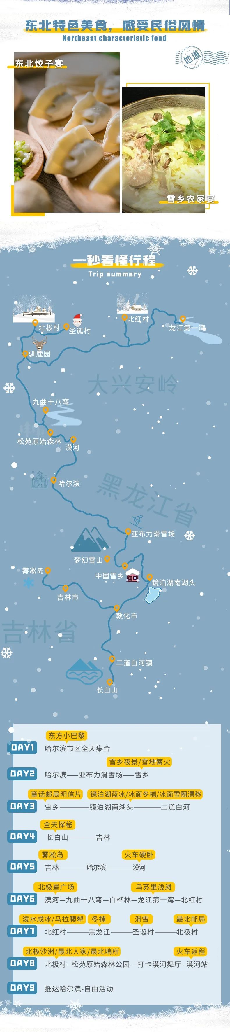 吉林-雾凇岛(48KM,车程约1小时)-哈尔滨(263KM,车程约5小时)