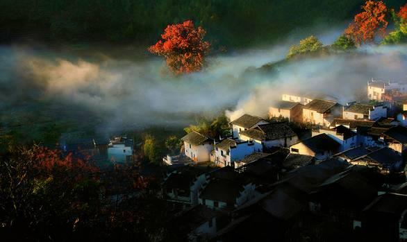 古枫成林,村舍聚集。清晨雾气或炊烟中的火红枫树美得惊人。石城的景色胜于晨景,5点至9点,石城晨雾和光影美轮美奂,变化多端,不知迷倒了多少人…