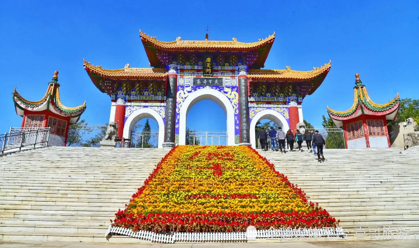 山东泰山南天门,在山东泰安市泰山上十八盘之尽处,旧称三天门、天门关,海拔1460米,山于此为最危耸。泰山南天门建在飞龙岩与翔凤岭之间的低坳处,双峰夹峙,仿佛天门自开。元中统五年(1264年)布山道士张志纯创建。门为阁楼式建筑,石砌拱形门洞,额题“南天门”。红墙点缀,黄色琉璃瓦盖顶,气势雄伟。门侧有楹联曰“门辟九霄仰步三天胜迹;阶崇万级俯临千嶂奇观”。