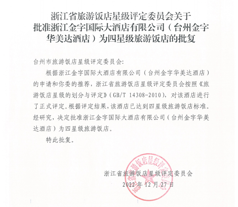 2022年12月27日,浙江省旅游饭店星级评定委员会正式发文浙文旅星评【2022】17号文件《浙江省旅游饭店星级评定委员会关于批准浙江金字国际大酒店有限公司(台州金字华美达酒店)为四星级旅游酒店的批复》,台州金字华美达酒店顺利获批成为四星级旅游酒店。