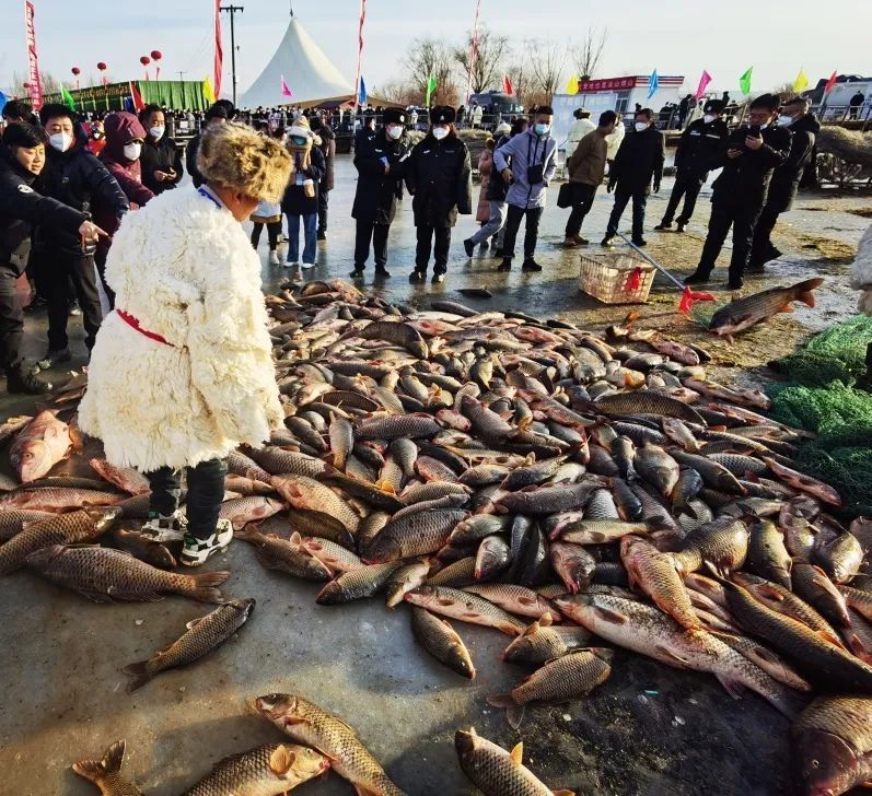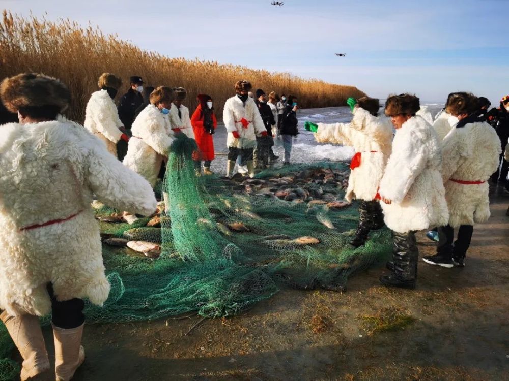 为冬捕队壮行后,人欢鱼跃兆丰年,热闹欢腾的冬捕渔猎场面,吸引游客簇拥围观。乌梁素海冬捕活动是自治区西部地区最大型冬季湖面现场捕鱼,本次冰雪节特邀请20名专业冬捕师现场作业,在乌梁素海湖面区下千米大网,利用传统方式收网,展现北方古老的冬季渔猎奇观,让游客现场体验壮观的冬捕景象。经过冬捕师们1个多小时的辛苦劳作,乌梁素海冬捕喜获丰收。今年冬捕第一网捕获2000斤左右的鱼,其中有鲤鱼、草鱼、花鲢、白鲢多个品种,头鱼达32.8斤,现场拍得18000元。