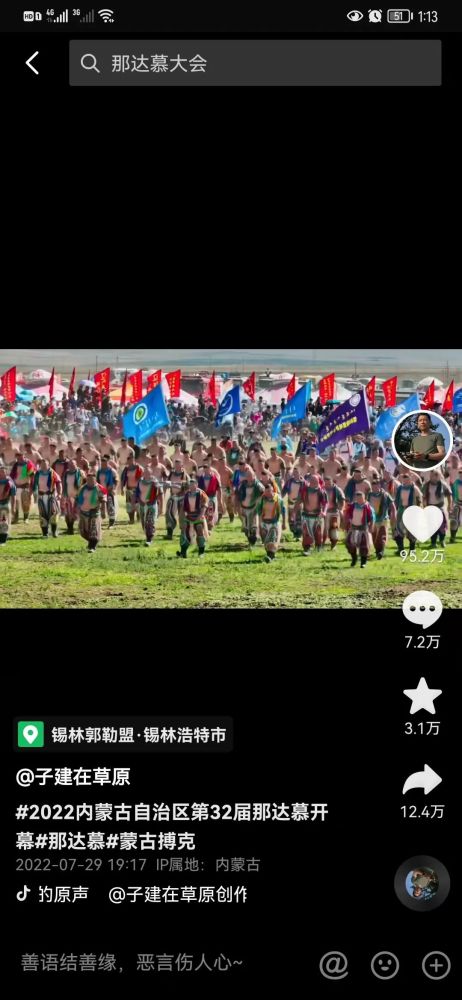 抖音、快手、微视频等短视频制作自媒体,围绕“感悟中华文化·畅游祖国北疆”“辽阔草原·锡林郭勒”“挑战马都车王”“争做汽车巴特尔”等主题,以赛车、音乐、穿越、搏克、射箭、赛马为题材,抢抓那达慕活动精彩瞬间,创作发布短视频1000余部。据不完全统计,截至8月3日,全网点赞1万以上那达慕相关短视频超过50部,近20部短视频点赞量超过20万,播放量100万以上短视频超过30部,“子健在草原”拍摄的开幕式搏克方队吸引95万人点赞,播放量达到3659万。“这就是内蒙古的氛围感”话题冲上热搜,占据热搜榜单第50位,同时在看人数突破500万,全网围观人数突破1亿。