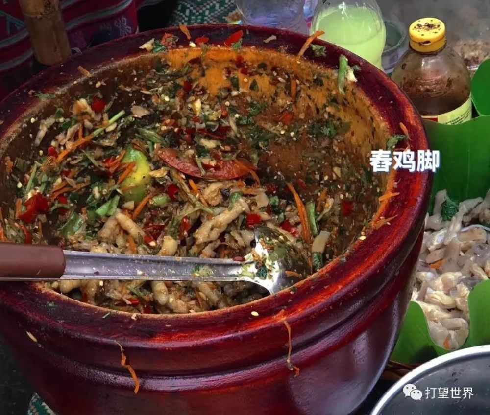 所谓舂,把各种调料,大蒜,香草,辣椒,炸花生等同煮熟的主菜一起放到石臼里舂。就拿舂鸡脚为例吧,鸡爪子和各种调料和香草的味道融合在一起,又辣又香又酸爽。