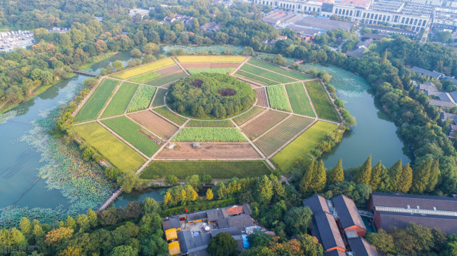 八卦田遗址,过去这里曾是南宋皇家籍田的遗址,田丘形似半阴半阳的太极图,八块田地上分别栽培不同植物,四季色彩、形状不断变化,仿佛呈现八种卦象。